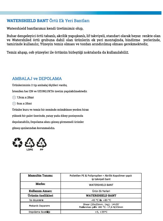 BUHAR DENGELEYİCİ ÖRTÜ TABANLI,AKRİLİK YAPIŞKANLI,LİF TAKVİYELİ ,STANDART OLARAK BEYAZ RENKTE OLAN VE WATERSHİLED ÖRTÜ GRUBUNA DAHİL OLAN ÜRÜNLERİN EK YERİ MONTAJINDA,BİNDİRME YERLERİNDE ,TAMİRİNDE KULLANILIR.YÜZEYİN TEMİZ OLMASI VE TOZDAN ARINDIRILMIŞ OLMASI GEREKMEKTEDİR.
